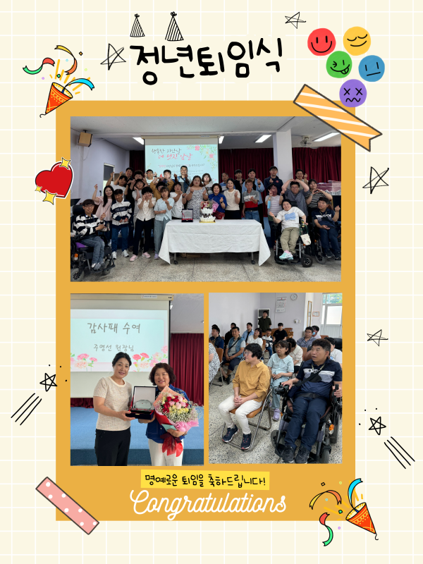 2024/6/13 정년 퇴임식 페이지 정보 작성자최고관리자 댓글 0건 조회 431회 작성일 24-06-19 15:05 본문 - 내 용 : 정*영 과장님 정년퇴임식- 일 시 : 2024년 6월 13일 목요일 13시30분- 장 소 : 자생원 강당 목록 답변 이전글2024/7/8 7월 생일프로그램 24.07.08 다음글2024/6/5 6월 생일프로그램 24.06.19 댓글목록 댓글목록 등록된 댓글이 없습니다.