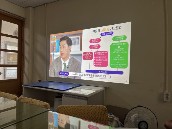 2022/06/15 종사자 직장 내 성희롱 예방교육 페이지 정보 작성자최고관리자 댓글 0건 조회 594회 작성일 22-06-16 14:47 본문 1. 교육내용 : 법정 의무교육인 직장 내 성희롱 예방교육2. 교육일시 : 2022. 6. 15. (수) 09:00 ~ 10:00 3. 교육방법 : 동영상 시청을 통한 집합교육 (소요시간 1시간) “뭉쳤다! 국내 최고의 소통전문가와 공인노무사”- 고용노동부 목록 답변 이전글2022/07/07 7월 생일프로그램 22.07.07 다음글2022/06/02 6월 생일프로그램 22.06.02 댓글목록 댓글목록 등록된 댓글이 없습니다.