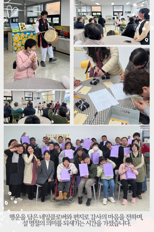 2026/2/10 2026년 설 명절 프로그램 페이지 정보 작성자최고관리자 댓글 0건 조회 105회 작성일 26-03-04 11:52 본문 - 내 용 : 2026년 설 명절 프로그램(감사 편지쓰기&네잎클로버키링 선물포장/감사릴레이/명절선물 및 다과나눔)- 일 시 : 2026년 2월 10일 화요일 - 장 소 : 성광직업재활원 분원 휴게실 목록 답변 이전글2026/3/6 3월 생일프로그램 26.04.01 다음글2026/1/2 2026년 시무식 26.01.02 댓글목록 댓글목록 등록된 댓글이 없습니다.